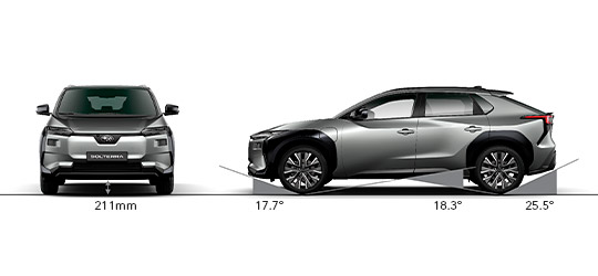SOLTERRA je skutečné SUV se světlou výškou potřebnou pro jízdu v terénu. Nájezdový úhel vpředu, vzadu i přechodový úhel jsou navržené tak, aby byla i v terénu zajištěna ochrana karoserie i trakční baterie.